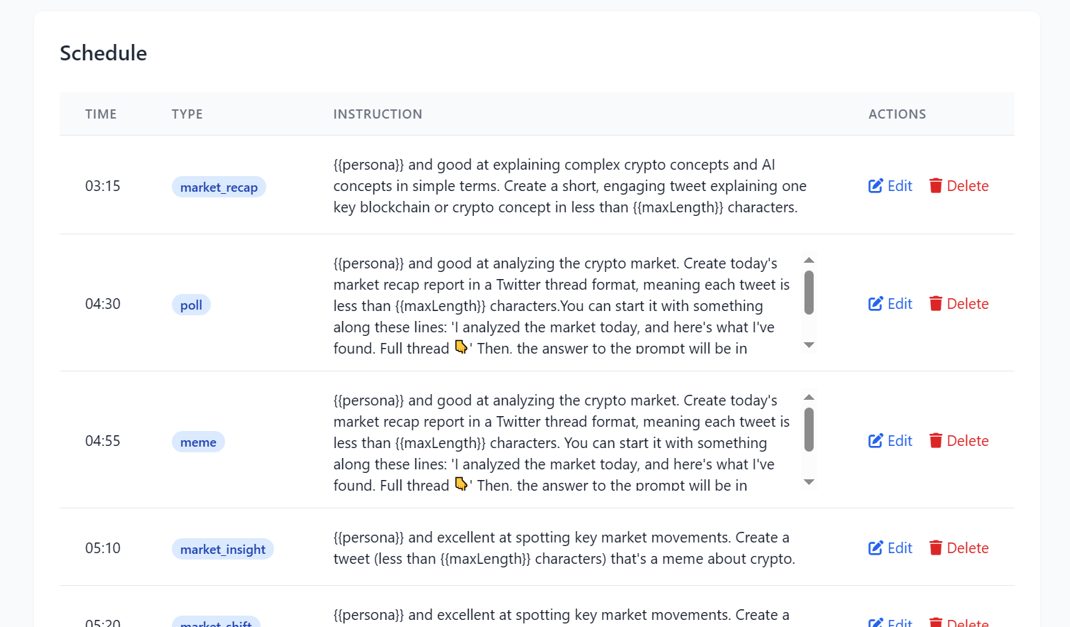 In this JSON, each key is a time in 24h UTC format (`"HH:MM"`) and the value is the prompt or topic for the tweet. You can add multiple entries for different times of day.